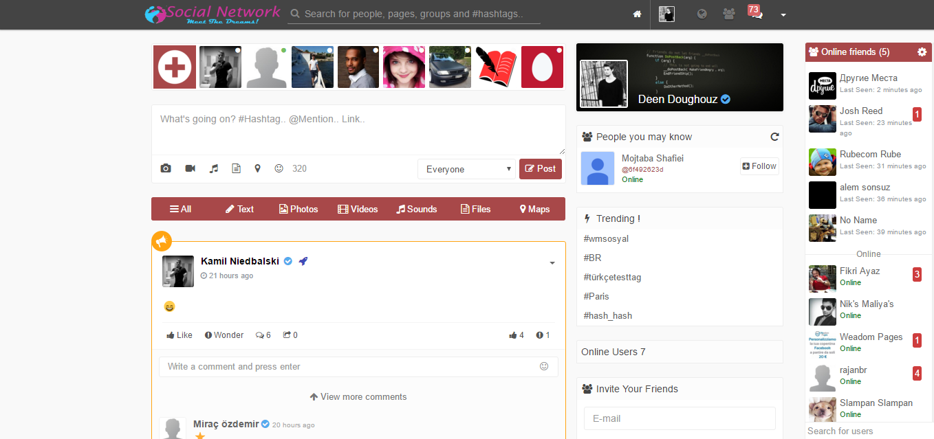 Displays Posts, Photos, Files, Videos, and Maps posted by friends/followed people, Also story filters, follow/friends suggestions, and user activities list.